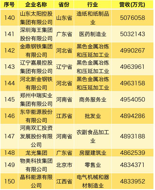 8月22日,2019中國民營企業(yè)500強(qiáng)峰會在青海省西寧市召開,峰會上發(fā)布了中國民營企業(yè)500強(qiáng)榜單,遼寧嘉晨控股集團(tuán)有限公司榜單排名第143位, 2019中國民營企業(yè)制造業(yè)500強(qiáng)榜單排名第77位。